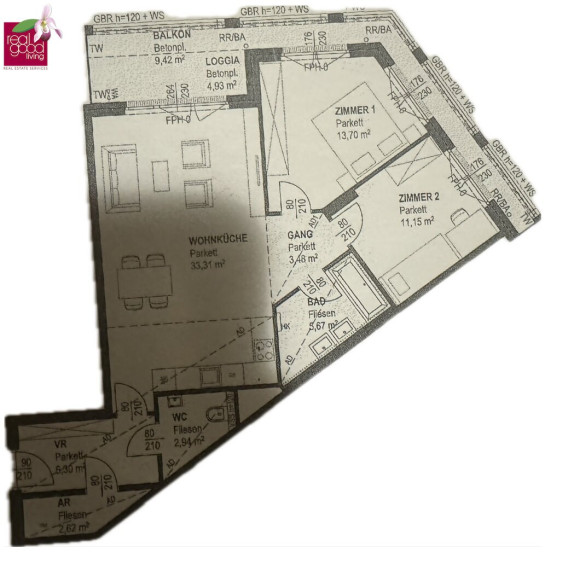 In den Wohnräumen finden Sie schöne Eichenparkettböden und in den Nassräumen Feinsteinzeugfliesen.