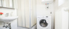 Das moderne Badezimmer mit schwarzer und weißer Verfliesung verfügt über eine Dusche, ein Waschbecken, einen Spiegelschrank sowie einen Waschmaschinenanschluss. Dank des Fensters genießen Sie auch hier natürliches Tageslicht. Die separate Toilette befindet sich ebenfalls im Vorraum.