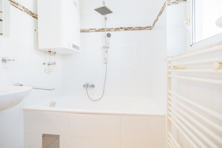 Das moderne Badezimmer ist mit einer Badewanne und einem Spiegelschrank ausgestattet – ideal für entspannte Wohlfühlmomente. Die separate Toilette sorgt für zusätzlichen Komfort.