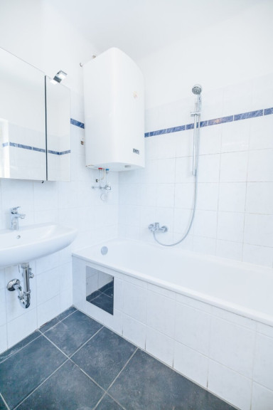 Das Badezimmer überzeugt mit seiner modernen Gestaltung und der komfortablen Badewanne, die zur persönlichen Wellness-Oase wird. Hier können Sie sich nach einem arbeitsreichen Tag entspannen und neue Kraft schöpfen.
