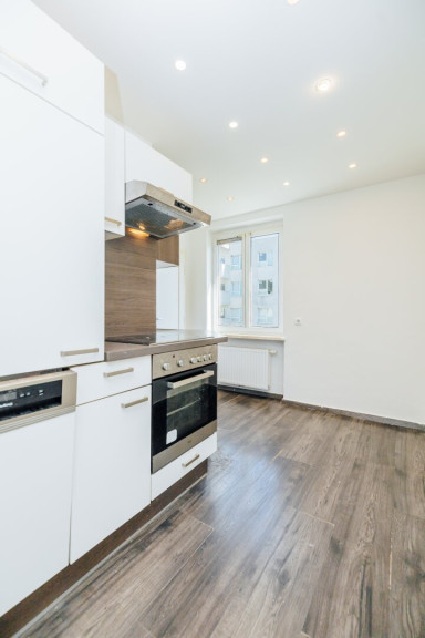 Große Fenster sorgen für viel natürliches Tageslicht. Der moderne Laminatboden schafft eine warme Atmosphäre und lässt sich wunderbar mit verschiedenen Einrichtungsstilen kombinieren. - Voll ausgestattete Einbauküche