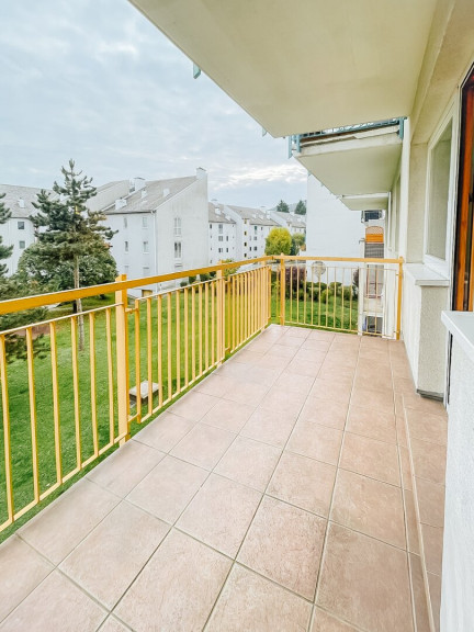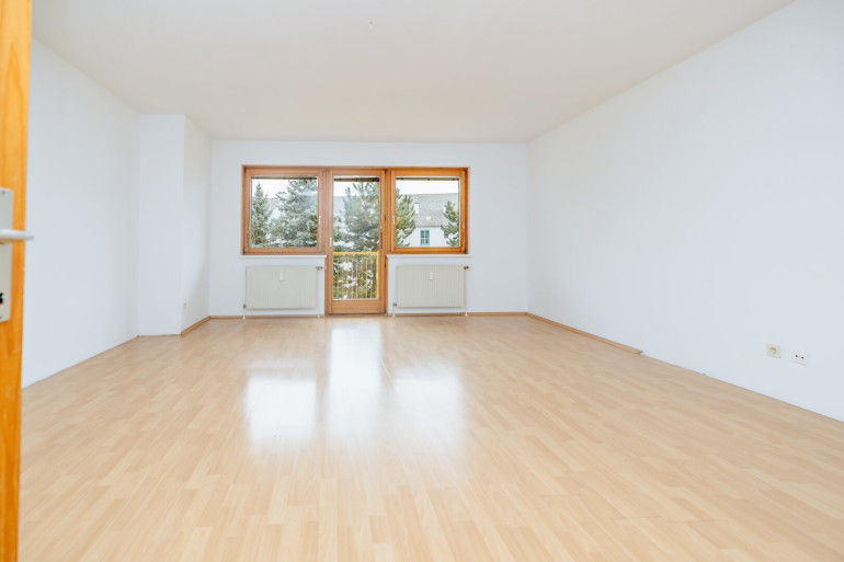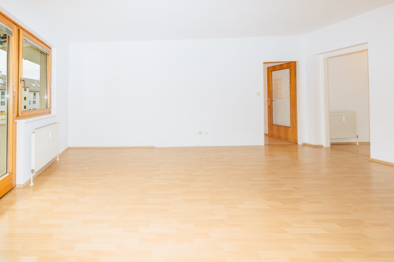 Der Balkon ist direkt vom Wohnzimmer aus begehbar, südlich ausgerichtet und bietet einen ruhigen Platz zum Entspannen, Essen oder Arbeiten im Freien. - Großzügiges Wohnzimmer mit direktem Zugang zum Außenbereich