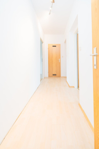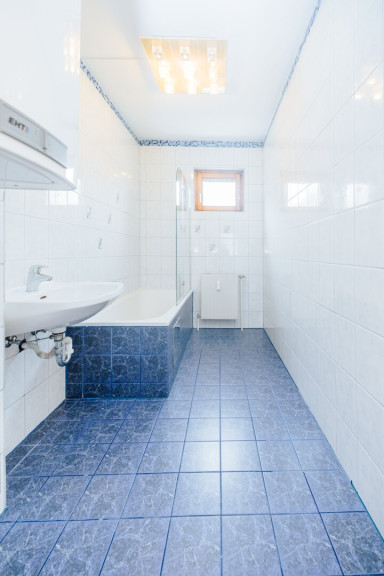 Ein kurzer Flur verbindet drei weitere Zimmer, die sich optimal als Schlafzimmer, Kinderzimmer oder Homeoffice nutzen lassen. Das Badezimmer ist ebenfalls vom Flur aus zugänglich und verfügt über ein Fenster, eine Badewanne, ein Waschbecken sowie einen Waschmaschinenanschluss.