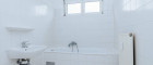 Das Badezimmer ist hell gefliest, verfügt über eine Badewanne, Waschbecken, Waschmaschinenanschluss und ein Fenster. Die Toilette ist separat begehbar.