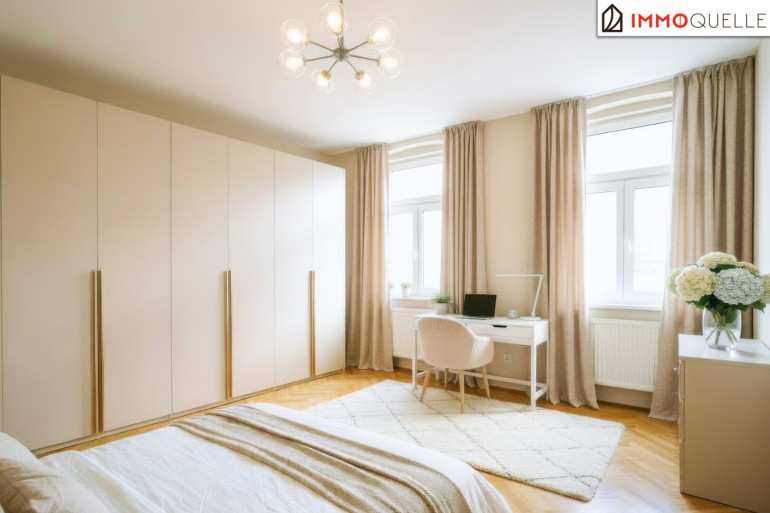 Direkt angrenzend befindet sich das etwa gleich große Schlafzimmer - ein Rückzugsort, der ebenfalls von der freundlichen Belichtung profitiert. Hier lässt es sich träumen, schlafen und ankommen. Die beiden Zimmer sind durch eine klare Raumlinie voneinander getrennt und und bieten zugleich eine harmonische Verbindung - ideal für unterschiedliche Wohnstile mit Anspruch an Klarheit und Komfort.