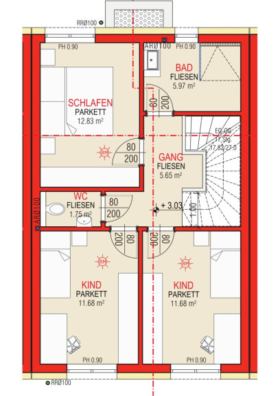 - Im Bad und WC im EG und OG kommt ein satiniertes Glas ohne Rollläden