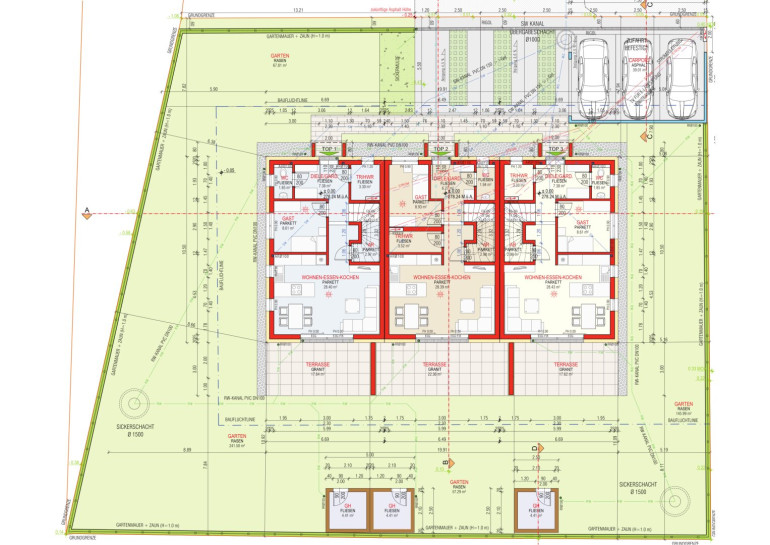 - Der Eingangsbereich und die Carports werden in Beton ausgeführt