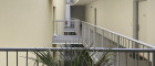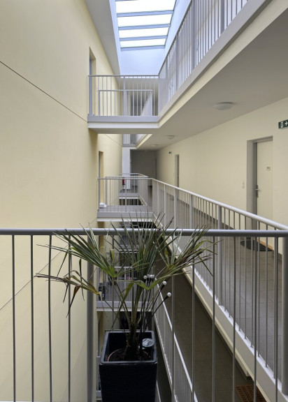 Der Weg zur Wohnung führt über den ruhigen Innenbereich der Anlage. Eine kleine Brücke bildet den letzten Schritt bis zur Eingangstür – fast wie ein Burggraben zwischen öffentlichem Raum und dem eigenen Rückzugsort.