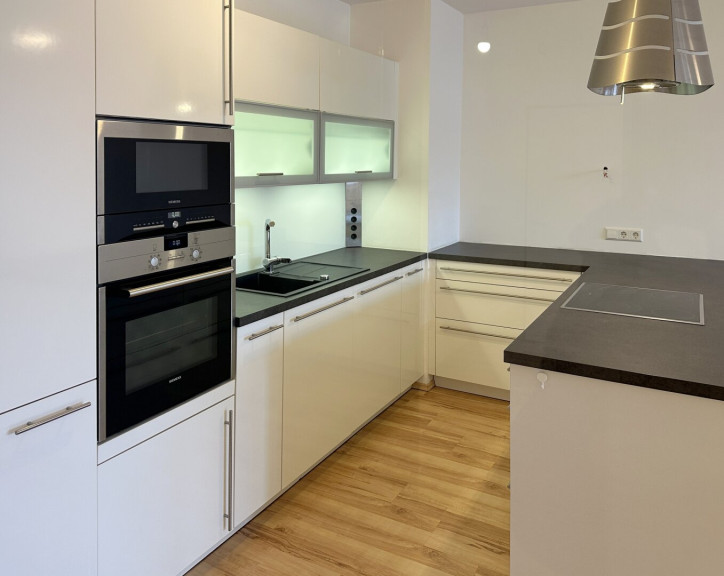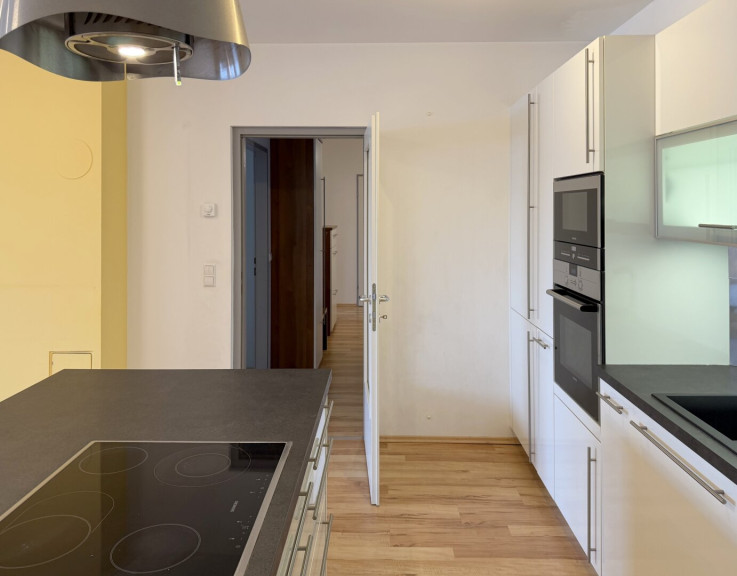 Auf rund 73 m² entfaltet sich ein Grundriss, der klug gedacht und angenehm unaufgeregt ist. Mittelpunkt ist die Wohnküche – offen, lichtdurchflutet und südseitig ausgerichtet. Ein Raum, der tagsüber von Sonne lebt und abends zur Bühne für Alltag und Begegnung wird. Die moderne Küche mit Siemens-Geräten fügt sich selbstverständlich ein, funktional und hochwertig, ohne laut zu sein. Ein Esstisch links, die Couch rechts, oder umgekehrt. Fernseher fast nicht notwendig, ist der Blick hinaus doch mindestens genauso entspannend.