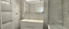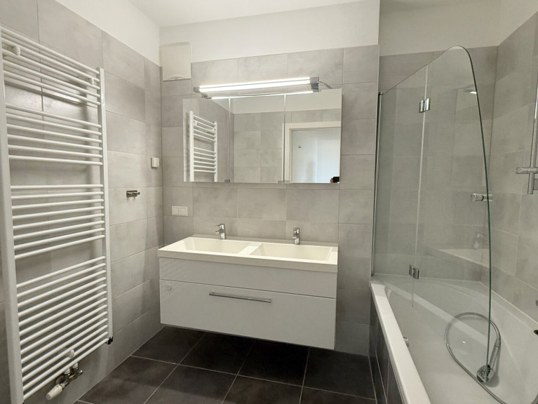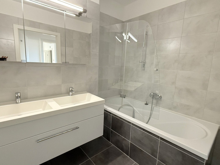 Badezimmer mit Badewanne, Doppelwaschbecken und Waschmaschinenanschluss
