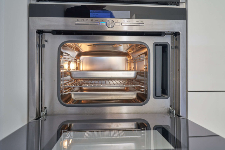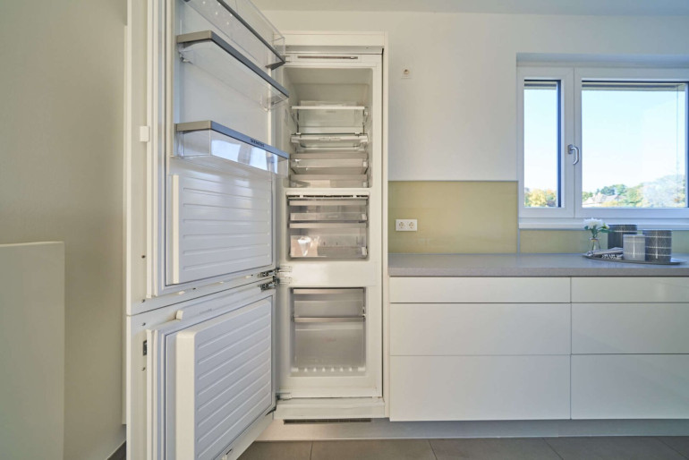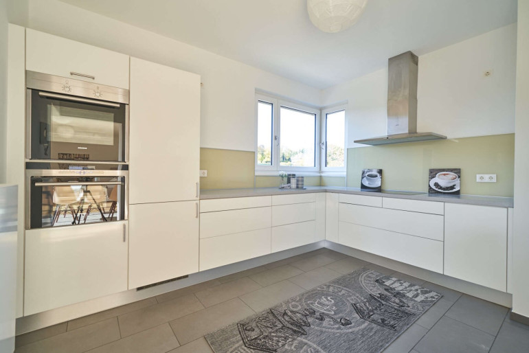 + vollausgestattete Küche (inkl. Dampfgarer!) mit Blick in die umliegenden Weingärten