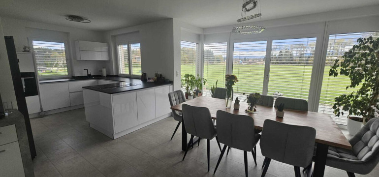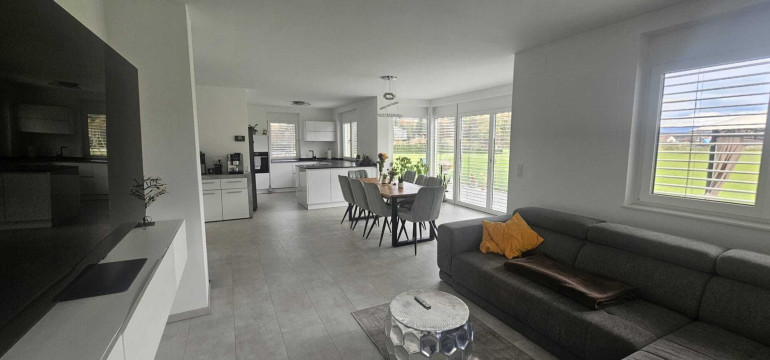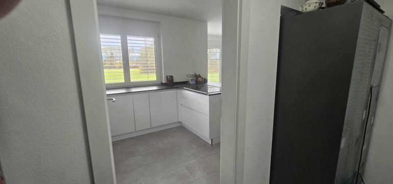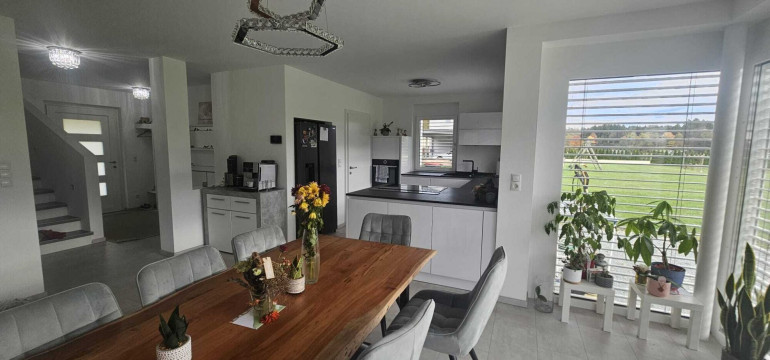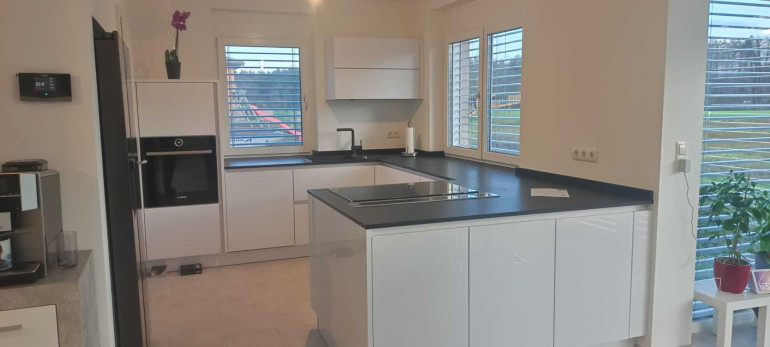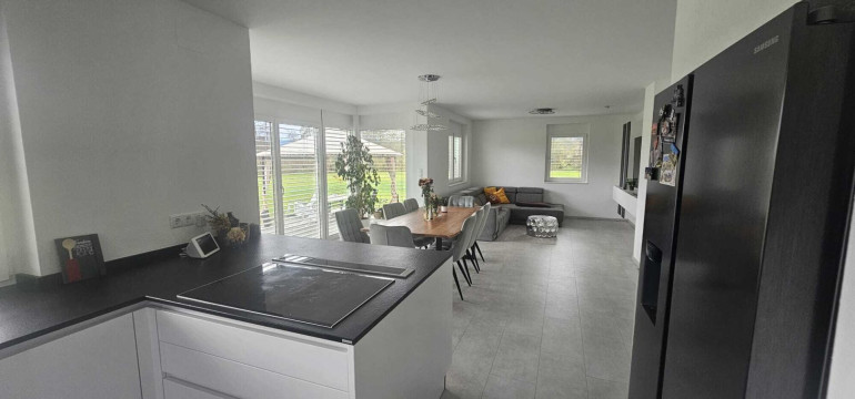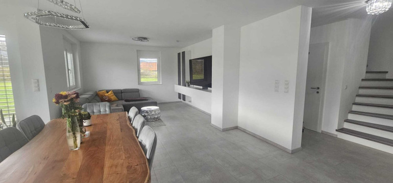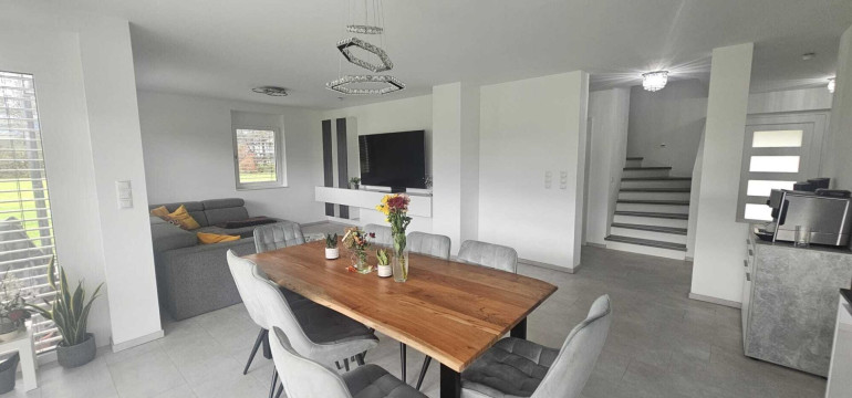 Sie haben ein schlüsselfertiges Einfamilienhaus mit hohem Wohnkomfort und mit einer nagelneuen sehr modernen Küche in einem großen Wohn-Eßzimmerbereich.