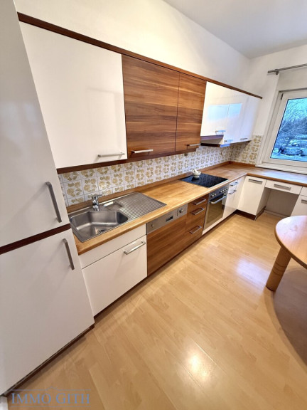 Aus dem Wohnzimmer gelangt man direkt in die großzügige Küche, die viel Arbeitsfläche und Stauraum bietet und funktional ausgestattet ist.