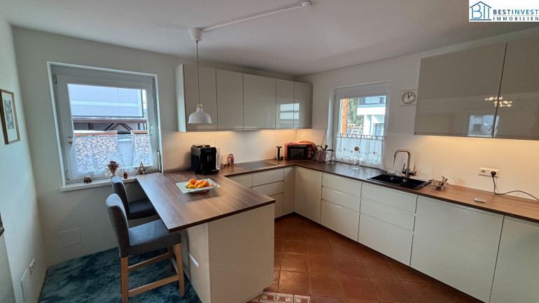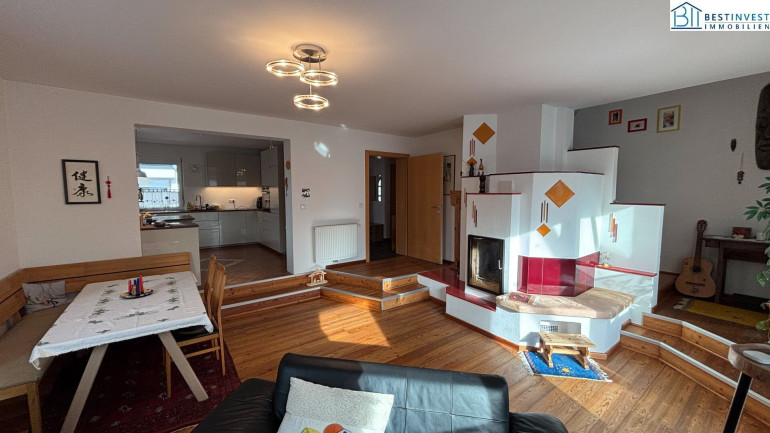 Auf großzügigen Wohnfläche erstrecken sich fünf lichtdurchflutete Zimmer, die viel Raum für Ihre persönliche Entfaltung bieten. Die offene Wohnküche und das gemütliche Wohnzimmer mit Kachelofen sind das Herzstück des Hauses. Hier können Sie unvergessliche Momente mit Familie und Freunden verbringen.