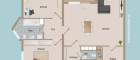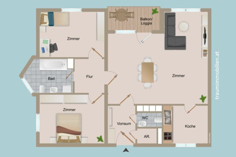 * Raumaufteilung: Vorraum, WC, Abstellraum, Küche, 3 Zimmer, Flur, Badezimmer