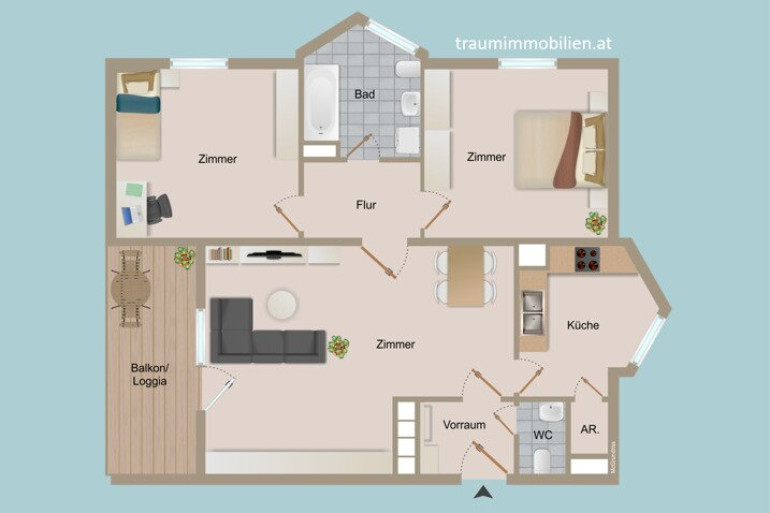 * Raumaufteilung: Vorraum, WC, Abstellraum, Küche, 3 Zimmer, Flur, Badezimmer