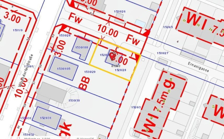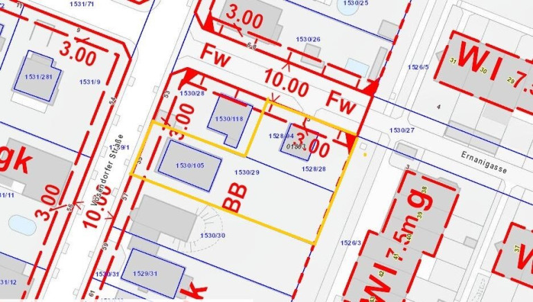 Dieses Grundstück ca.593 qm befindet sich auf einem Grund der als Wohngebiet (W/ (ogk)) gewidmet ist, siehe F+B. Ein Gebäude(Altbestand) ist jeweils Teil des Grundstücks.