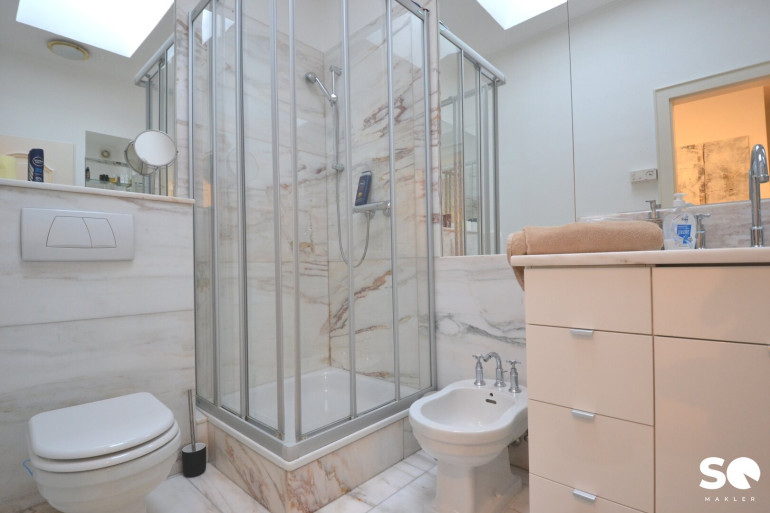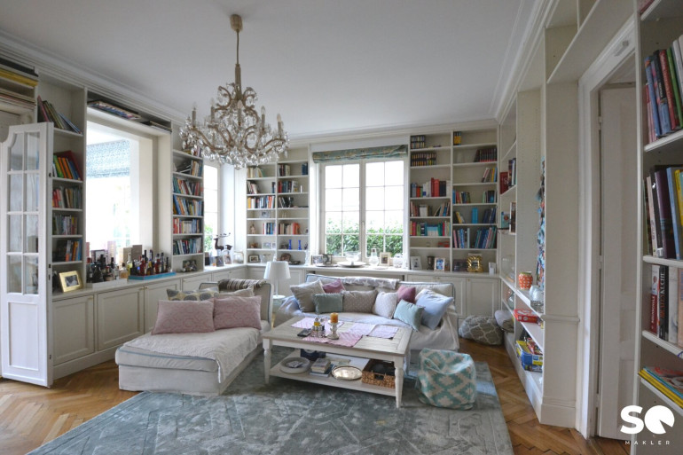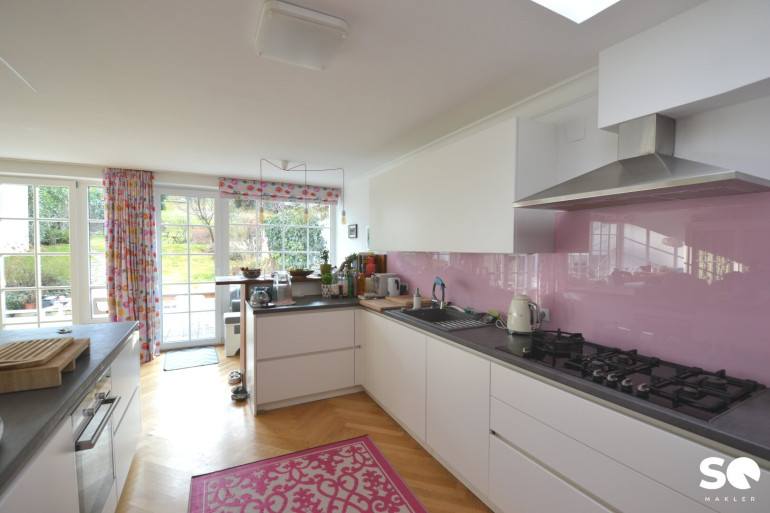 Insgesamt gibt es 6 Schlafzimmer, 5 Bäder, 5 WC, mehrere Abstell- und Schrankräume, Terrassen auf 3 Ebenen - 45m² auf Gartenebene, einen südseitigen Garten sowie eine Garage mit E-Ladestation.