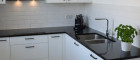 - Boden: Vinyl - schwarz in Fliesenoptik, im Bad Fliesen