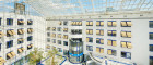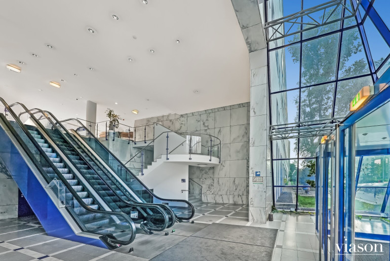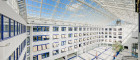 Eine Rolltreppe verbindet den Eingangsbereich mit dem Glas-Atrium „Plaza“.