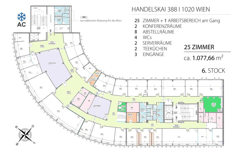 - ZIMMER: 25 + 8 Abstellräume (rosa markiert im Grundriss), 2 Teeküchen (orange markiert im Grundriss), 4 WCs (hellblau markiert im Grundriss), 2 Serverräume mit Serverkästen (grün markiert im Grundriss), 2 Konferenzräume (lila markiert im Grundriss), 3 Eingänge und ein Arbeitsbereich am Gang (Abtrennung mit Glaswand seitlich und Strom- und Internetdosen: weiß markiert im Grundriss)
