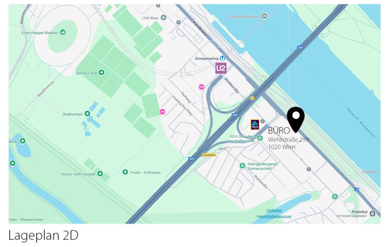 Eine leichte Erreichbarkeit des Bürogebäudes ist dank der nahegelegenen U-Bahn-Station U2 „Donaumarina“ sowie einer Busstation DIREKT VOR DEM Gebäude gegeben. Der Standort überzeugt durch seine Nähe zum Erholungsgebiet Donauinsel & Alte Donau und bietet auch einen schnellen Anschluss and die beiden Autobahnen A23 und A22.