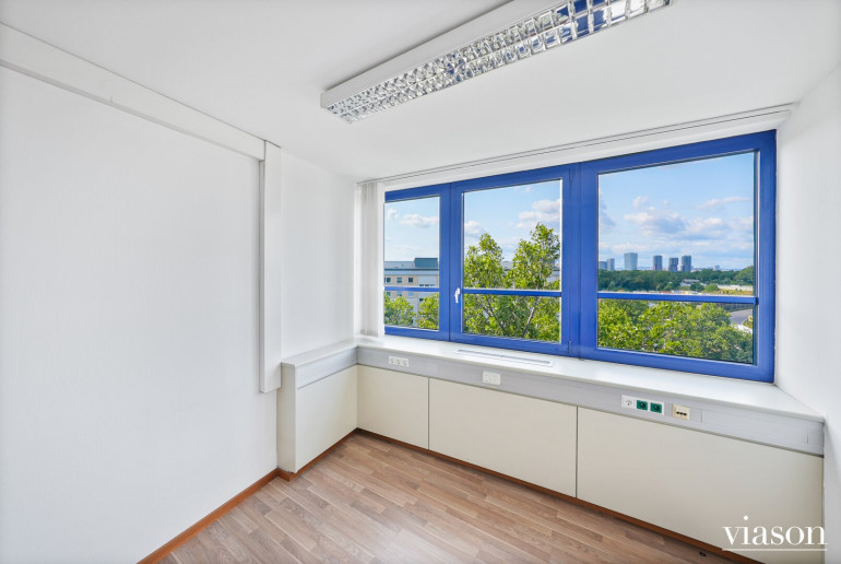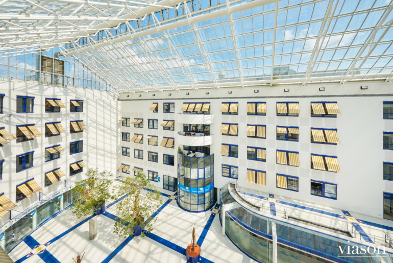 Das Büro ist mit Innenverschattungen (Jalousien) und teilweise mit Außenverschattungen (Markisen) ausgestattet (Bereich zum Glas-Atrium „Plaza“).