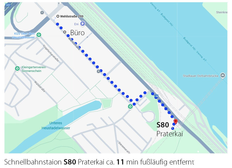 - ÖFFENTLICHER VERKEHR: U2 „Donaumarina“ ist in ca. 6 min fußläufig erreichbar, Bushaltestelle direkt vor dem Haus: BUS 77A, 79A, 79B. Die Schnellbahnstation Prater Kai S-Bahnlinie S80 ist in ca. 11 min fußläufig erreichbar.