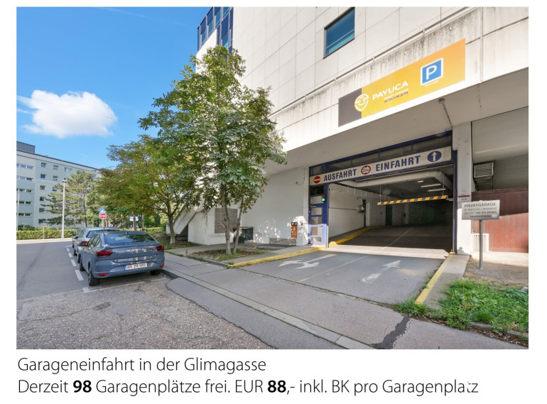 Die Garageneinfahrt befindet sich in der Gilmagasse. Derzeit (Stand 02.08.2025) sind 98 Garagenplätze frei und können angemietet werden. Der Mietzins pro Garagenplatz beträgt EUR 88,- (inkl. BK).