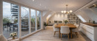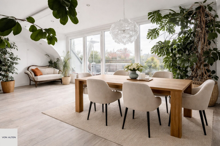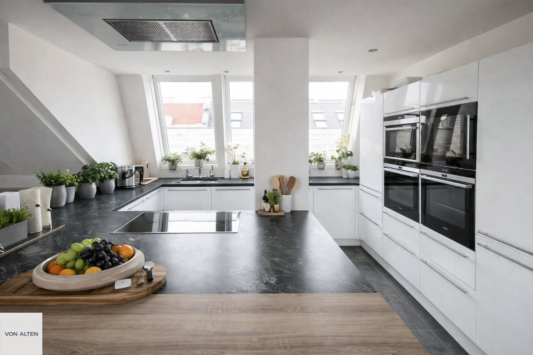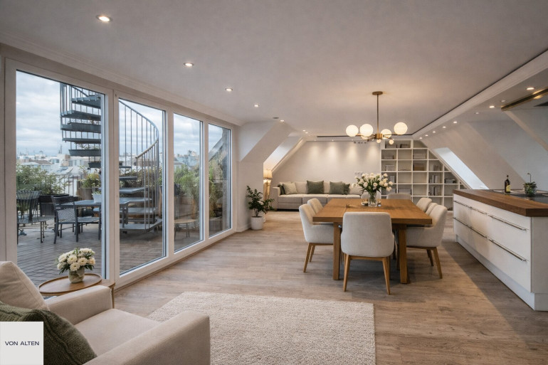 Über eine innenliegende Treppe oder alternativ bequem mit dem Personenaufzug gelangt man in das obere Dachgeschoss. Hier befindet sich der offen gestaltete, lichtdurchflutete Wohn- und Essbereich mit integrierter Küche, der das Zentrum der Wohnung bildet. Auf dieser Ebene liegen zudem ein weiteres Zimmer zzgl. begehbarem Kleiderschrank mit direkt angeschlossenem Badezimmer (bodengleiche Dusche, WC, Waschtisch, Fenster) und ein separates Gäste-WC.