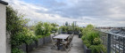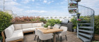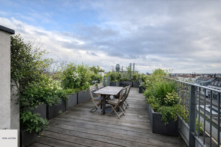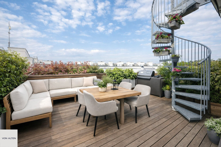 Vom Wohnbereich aus ist die Terrasse mit ca. 16 m² direkt begehbar. Eine weitere, großzügige Dachterrasse wird über eine außenliegende Wendeltreppe erschlossen. Insgesamt stehen rund 64 m² Terrassenfläche zur Verfügung.