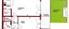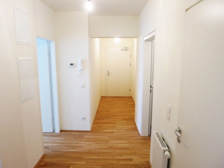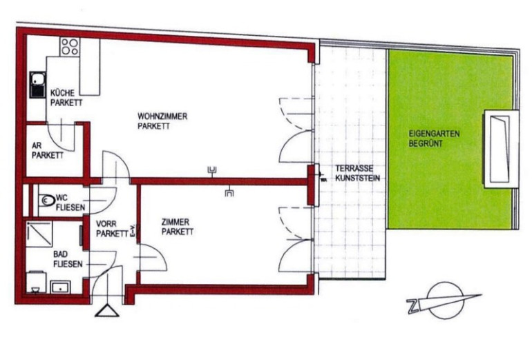 Die Wohnung gliedert sich in einen Vorraum, eine Wohnküche mit allen Geräten und großen Panoramafenstern, Speis und große Glastüre mit Zugang zum Eigengarten, ein Schlafzimmer mit Gartenausgang, ein Badezimmer mit Dusche, Waschmaschinenanschluss und ein separates WC mit Handwaschbecken.