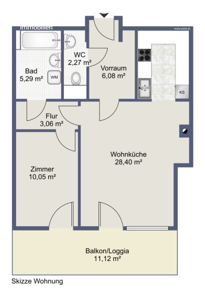 Die Wohnung befindet sich im 3. Liftstock eines gepflegten, im Jahr 2003 erbauten Wohnhauses. Sie umfasst eine Wohnfläche von ca. 63 m², die sich wie folgt aufteilt: