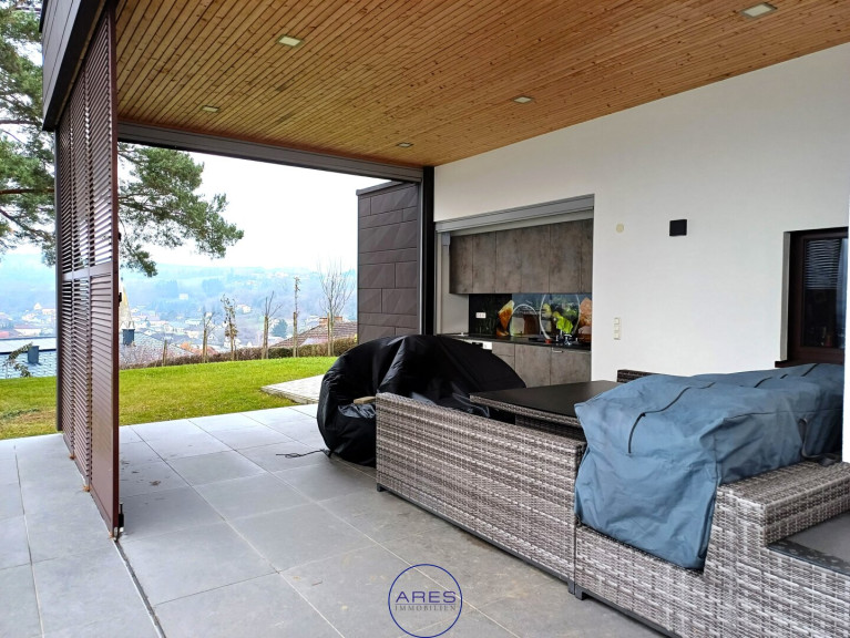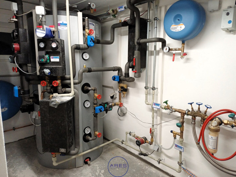 Die Fußbodenheizung - Luftwärmepumpe - vermittelt behagliche Wärme. Auch die Keller- und Lagerräume sind bestens ausgestattet. Keller und Waschküche sind sowohl innen als auch von außen erreichbar. Neben der ausgesprochen großzügigen Terrasse - teilweise überdacht und mit einer Sommerküche versehen - wurden zwei weitere Terrassen angelegt, eine vom einem der Kinderzimmer begehbar.