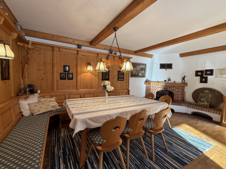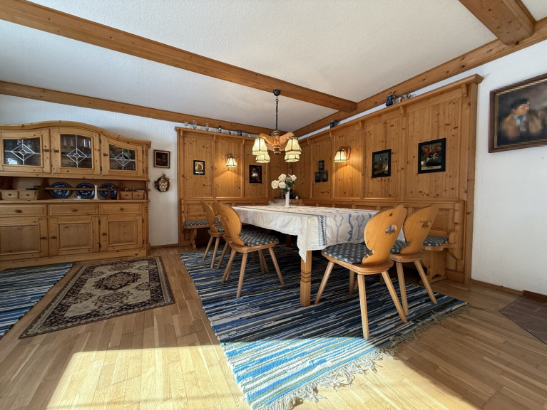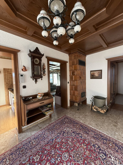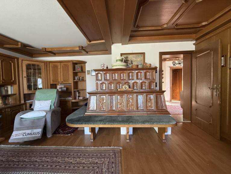 - Wohnzimmer: Großzügiges Wohnzimmer mit großem Kachelofen, der nicht nur Wärme spendet, sondern auch als stilvolles Designelement fungiert, von hier aus gelangt man auf die südwestseitige Terrasse und in das Esszimmer.