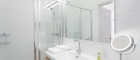 Im Badezimmer befindet sich eine Dusche, ein Waschtisch und ein großer Spiegel.