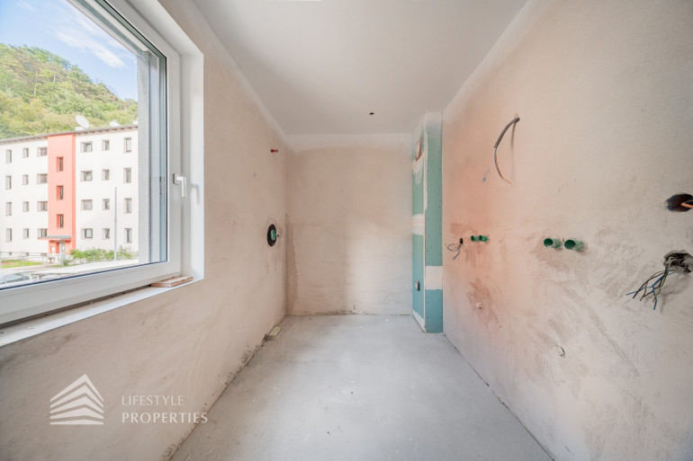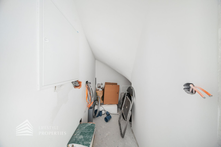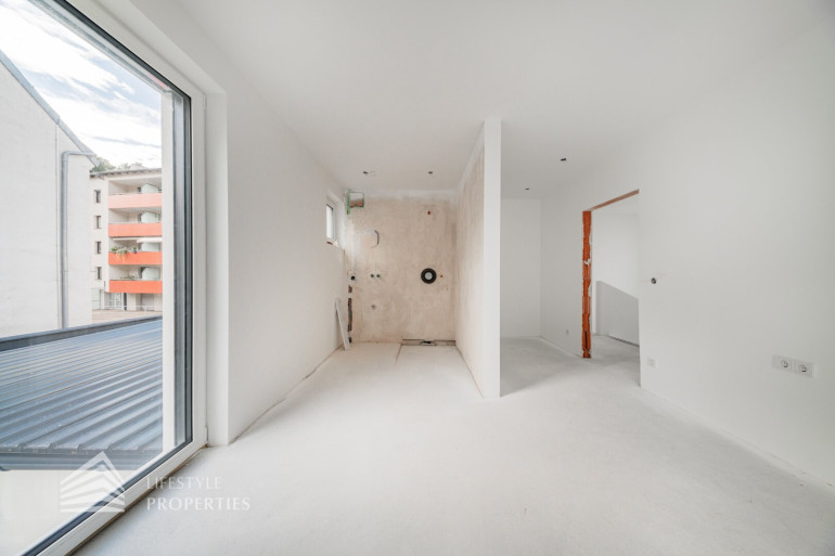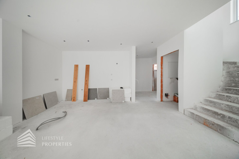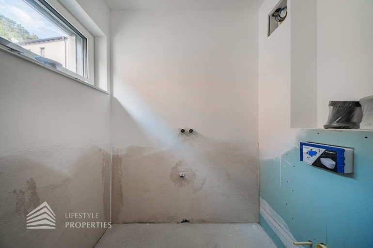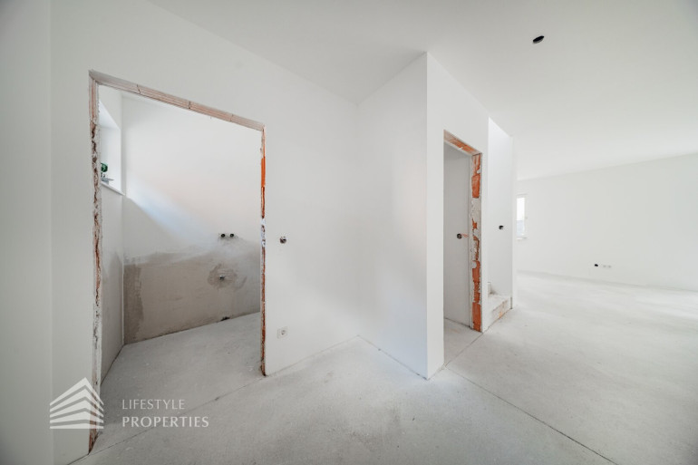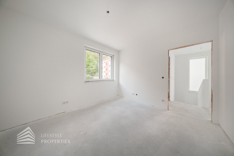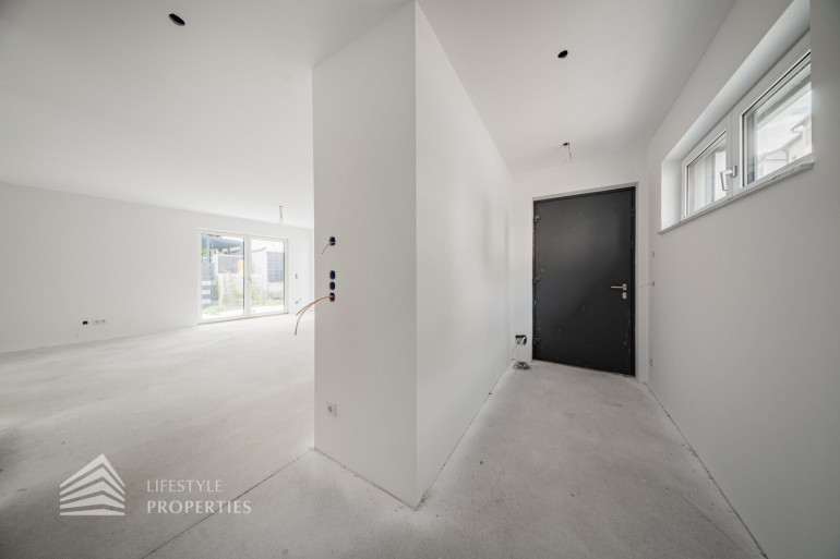 Beim Betreten des Hauses gelangen Sie zunächst in den einladenden Vorraum, der den perfekten Empfang für Bewohner und Gäste bietet. Direkt angrenzend öffnet sich der großzügige ca. 37 m² große Wohn- und Essbereich mit offener Küche, der durch seine offene Gestaltung sowohl für gesellige Abende als auch für gemütliche Familienmomente ideal ist. Ein separates WC sorgt für zusätzlichen Komfort, während der Abstellraum mit Waschmaschinenanschluss sowie das Küchenkammerl praktische Funktionalität bieten. Über die Terrasse im Erdgeschoss, die ca. 9 m² misst, gelangen Sie direkt in den Garten mit ca. 23 m², der zu entspannten Stunden im Freien, zum Spielen oder zu gemütlichen Abenden einlädt. Von hier aus gelangen Sie auf die private Dachterrasse mit ca. 40 m² , welche einen ungestörten Blick ins Grüne bietet – ein perfekter Ort für Entspannung, Sonnenbäder oder laue Sommerabende.