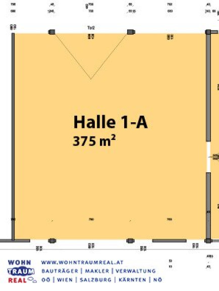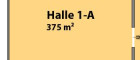 "Halle 1-A" bietet eine Fläche von 375 m², beheizbar und beleuchtet. Ein großes Doppel-Schiebetor erlaubt LKWs die Zufahrt und bietet daneben noch Platz. Die individuell nutzbare Fläche wird mit folgenden Daten zur Miete angeboten: