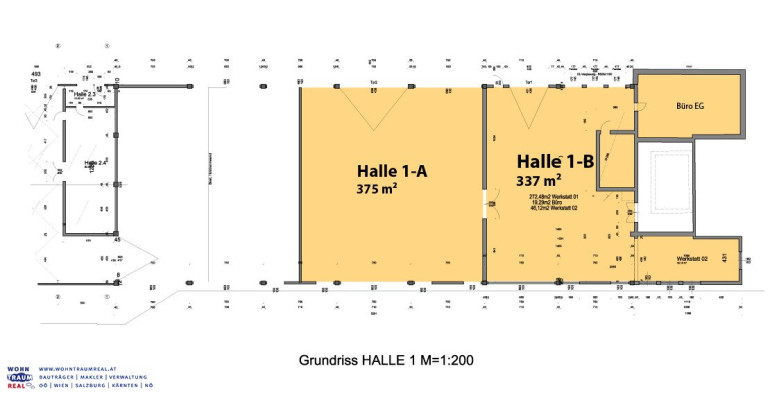 Die angegebenen Maße sind Basiswerte für das aktuell vorliegende Vermietungsangebot. Sie benötigen mehr Platz? Kein Problem! Die räumliche Trennung von der gesamten "Halle 1" (siehe Bild 2) wird erst nach gemeinsamer Abstimmung und abgeschlossenem Mietvertrag errichtet, bis dahin besteht Flexibilität für Ihre Anforderungen. Der aktuell offene Zugang zur nebenan befindlichen "Halle 1-B" wird auf Wunsch versiegelt.