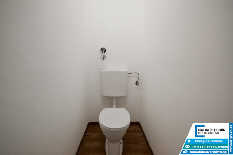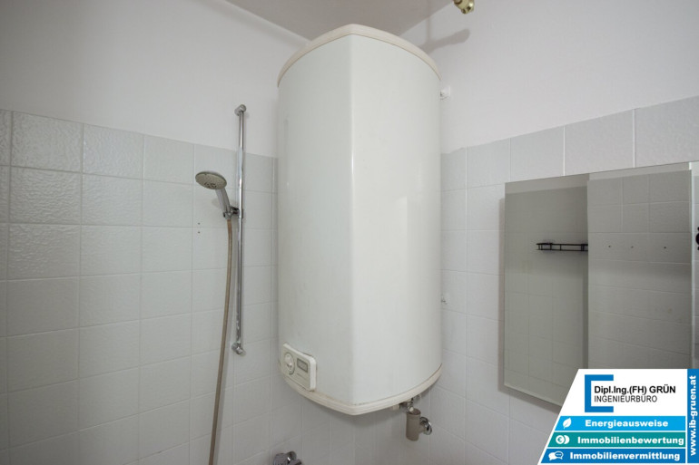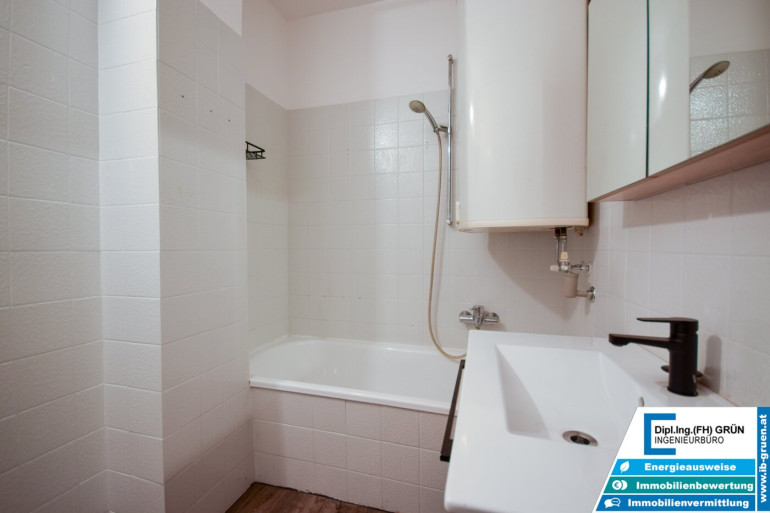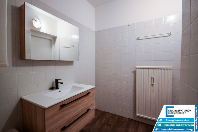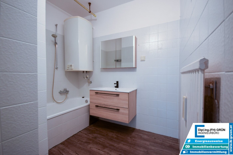 Das Badezimmer ist funktionstüchtig, braucht jedoch optisch etwas Liebe – eine gute Gelegenheit, eigene Ideen umzusetzen. Insgesamt ist die Wohnung selbst wie auch das gesamte Haus sehr gepflegt.