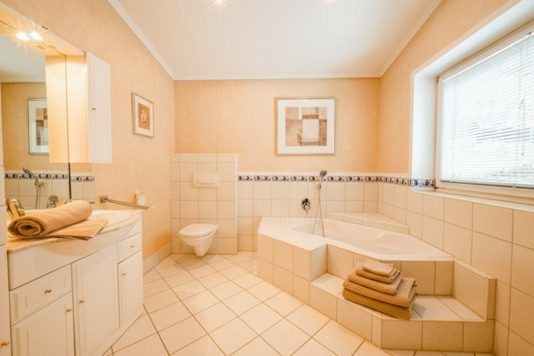 Das Badezimmer präsentiert sich als ein weiteres Highlight dieser Immobilie. Hochwertig ausgestattet mit einer Badewanne, Dusche und einem Waschtisch. Ein Fenster sorgt zudem für optimales Tageslicht.