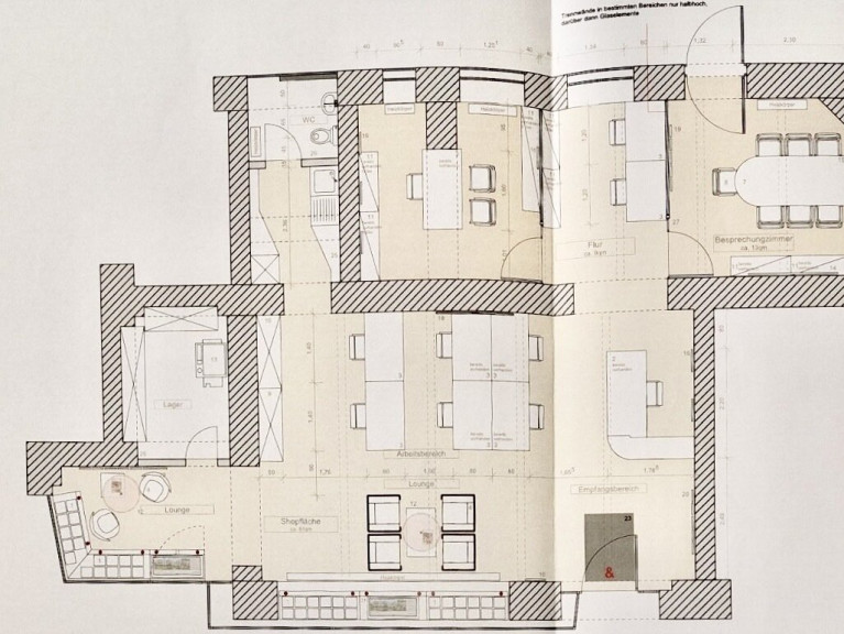 - Aufteilung: 1 großzügiger Geschäftsraum, 1 Abstell/Serverraum, 2 Büros, 1 Küche, 1 WC