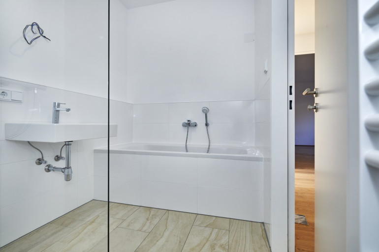 Das Badezimmer überzeugt mit feinster und modernster Ausstattung – formschönen Laufen-Sanitärkeramiken, großformatigen Fliesen, bodengleicher Dusche und komfortabler Badewanne.