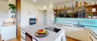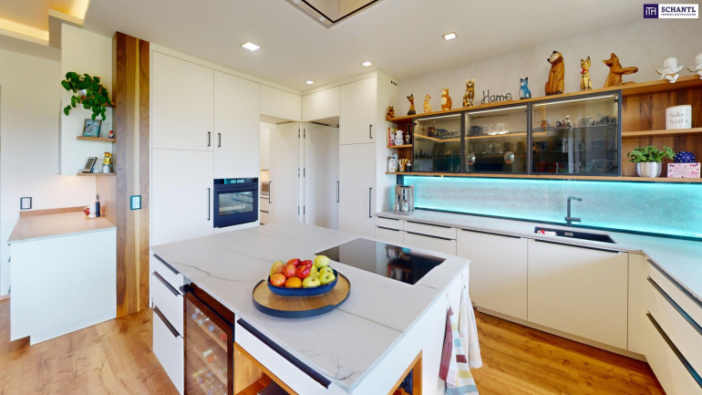 Das Herzstück bildet der lichtdurchflutete Wohn-Essbereich mit Panoramakamin und integrierter, sehr hochwertiger Designküche mit Echtstein-Arbeitsplatte – die liebevoll gearbeiteten Details wie z.B. polierte Steinadern in der Oberfläche und die indirekte Beleuchtung unterstreichen den exklusiven Charakter. Eine separate Vorbereitungsküche, die als Waschküche mit Platz für erhöhte Waschmaschine und Trockner konzipiert wurde, erfüllt höchste funktionale Ansprüche und ist dabei optisch perfekt eingebunden – ein Raum, von dem viele träumen.