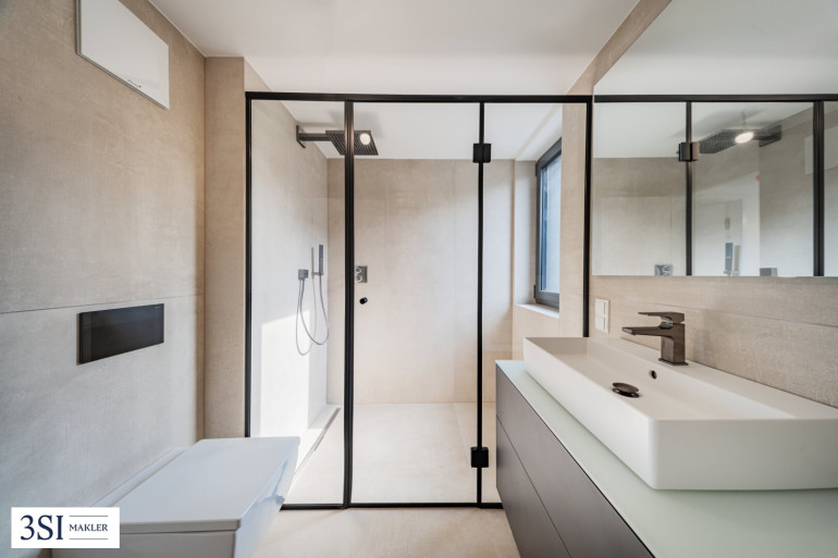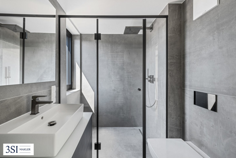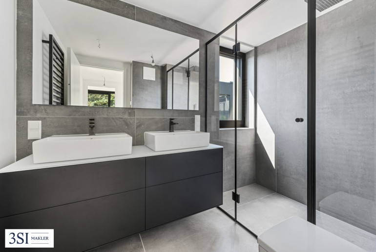 - Obergeschoß: 2 Schlafzimmer, Bad mit Doppelwaschbecken, Dusche und WC, 7 m² Balkon