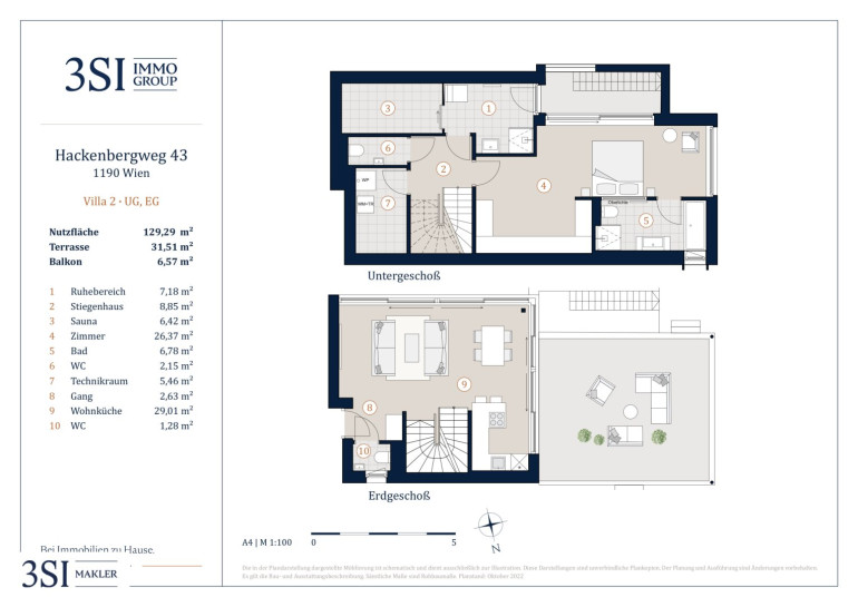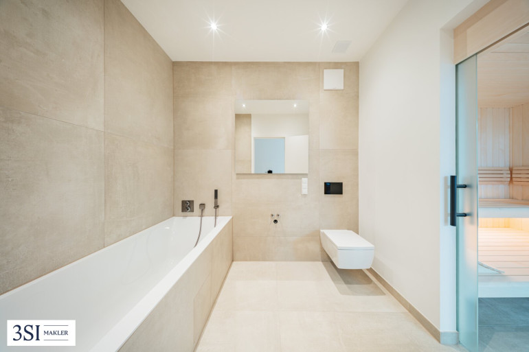 - Untergeschoß: Schlafzimmer, Bad mit Dusche, Wanne und WC, Sauna, Ruhebereich mit Dusche, Technikraum, WC, Zugang zum Pool und 192 m² Garten