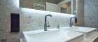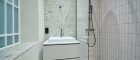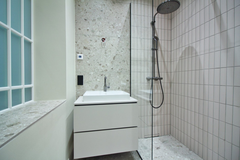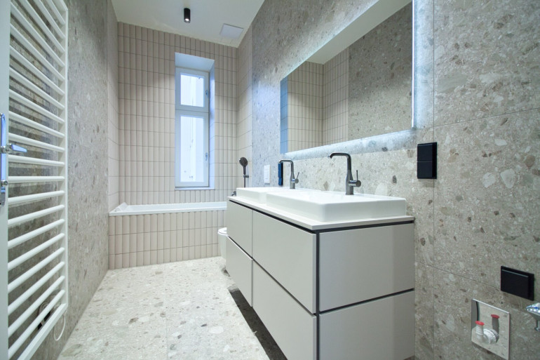 Der Wohnbereich überzeugt mit rund 22 m² und ist besonders hell und großzügig gestaltet. Gegenüber liegt die separate Küche, die somit funktional und optimal angeordnet ist. Direkt daneben befindet sich das zweite Badezimmer, ausgestattet mit Doppelwaschtisch, einem weiteren Waschmaschinenanschluss, Handtuchheizkörper und WC. Beide Bäder wurden mit hochwertigen Armaturen von Grohe und Hansgrohe ausgestattet und stilvoll umgesetzt. Auch die Fliesen sind ein absoluter Hingucker und unterstreichen das exklusive Ambiente.