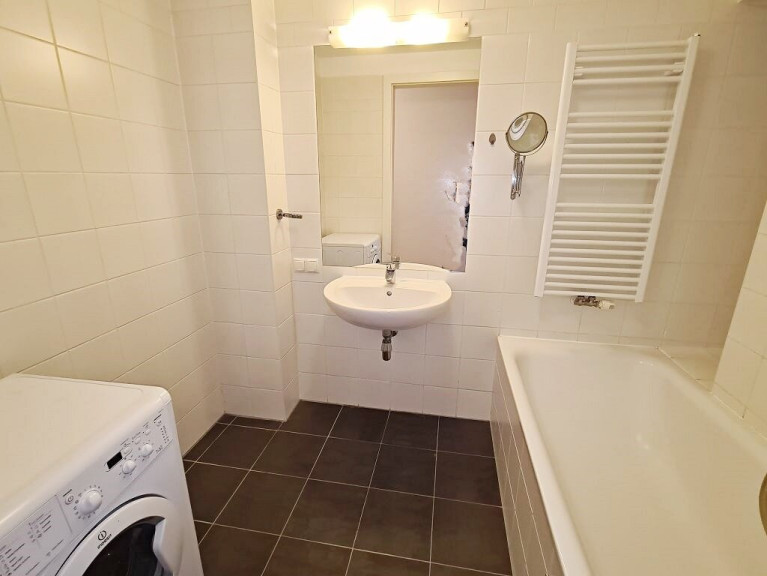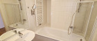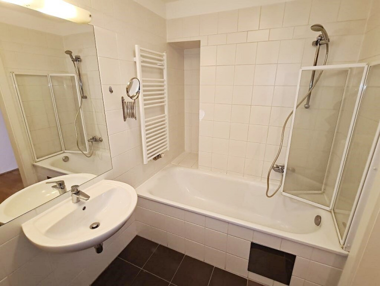 + Badezimmer mit Badewanne, Waschtisch und Waschmaschinenanschluss
