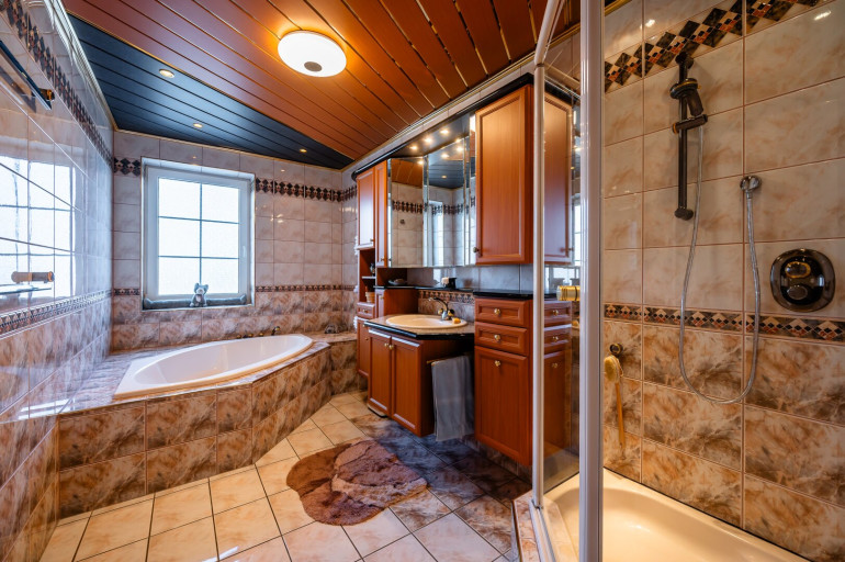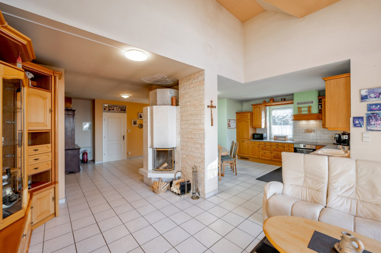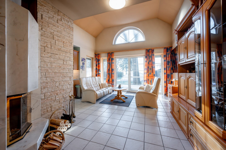 Technik: Beheizung mittels Fußbodenheizung (neuwertige Gas-Therme) sowie Kamin im Wohnzimmer, Kunststoff-Fenster mit Außenjalousien, Garage mit elektrischem Tor.