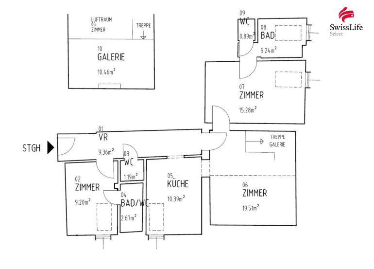 Mit dem Lift hinauf in den letzten Stock, schon betreten Sie Ihr neues Reich.